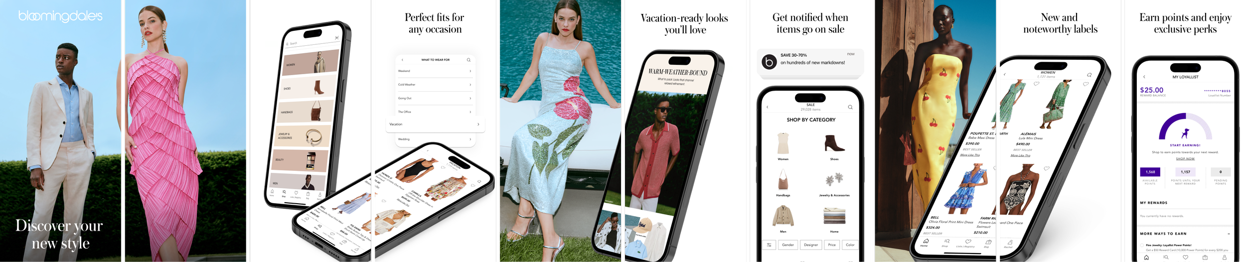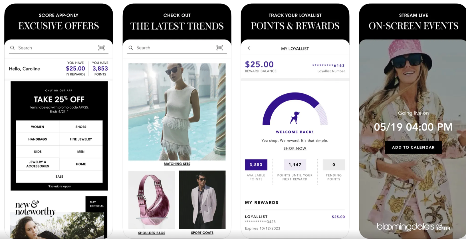 Bloomingdale’s App Store screenshots focused heavily on features like fast delivery, rewards and loyalty perks.